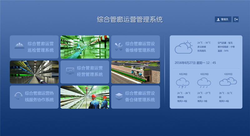 智慧管廊:以“知、控、警、決、管、營、享”為管理方針,以大數(shù)據(jù)、物聯(lián)網(wǎng)、云架構(gòu)、智能組態(tài)、綜合業(yè)務(wù)決策分析、人工智能等技術(shù)為支撐,結(jié)合城市地理信息系統(tǒng)(GIS)和建筑信息模型(BIM),通過整合各數(shù)據(jù)分析,構(gòu)建指揮統(tǒng)一、功能齊全、反應(yīng)靈敏、運(yùn)轉(zhuǎn)高效的管廊運(yùn)行綜合管理平臺,包括1個(gè)中心、1個(gè)平臺、7個(gè)應(yīng)用系統(tǒng)、N個(gè)終端,對綜合管廊內(nèi)環(huán)境、設(shè)備及運(yùn)行進(jìn)行實(shí)時(shí)監(jiān)控、運(yùn)營管理和安全預(yù)警,提高決策指揮效率,切實(shí)提高處置突發(fā)安全事件的能力,以保障系統(tǒng)安全、高效運(yùn)行。